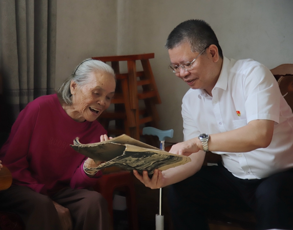 张国一行来到老党员石玉芬奶奶的家中,86岁的石奶奶激动地和大家分享了当年和毛主席合影的幸福时刻。1962年,石奶奶作为广西民族歌舞团的一员,有幸加入到广西少数民族国庆观礼团,并登上国庆观礼台,10月1日,全国少数民族国庆观礼团全体成员受到党和国家领导人亲切接见,并留影纪念。当时毛主席问石奶奶是哪里人?她回答说:“我是广西人。”毛主席还问石奶奶是做什么的?她答道:“我是种田的。”毛主席就说:“种田好啊,我们都要吃饭的呀!”……几句寒暄之后,全体成员和毛主席留下了珍贵的合影,并刊登在当时的《民族画报》上,石奶奶至今还珍藏着这本画报。