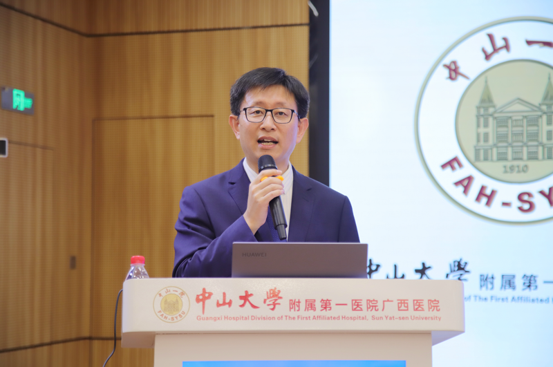 揭牌仪式结束后,中山一院神经外科郭少雷教授、肿瘤科龙健婷教授、放疗科王岩教授,广西壮族自治区人民医院副院长瞿申红教授,中山一院广西医院副院长杨超教授分别以《鼻眶颅底缺损修复探讨》《头颈部鳞癌内科治疗2025更新要点》《鼻颅底肿瘤放疗现状》《多学科支撑下的累及颈内动脉鼻咽癌相关病灶的外科策略》《鼻颅底外科术后水盐代谢紊乱》为主题进行授课分享。中山一院病理科刘大伟教授通过线上方式分享了《鼻颅底神经内分泌肿瘤的病理学发展现状》的内容。